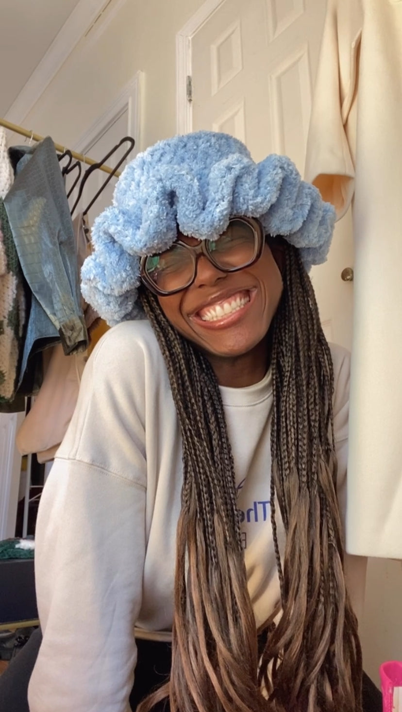 Fluffy, soft bucket hat in light blue.