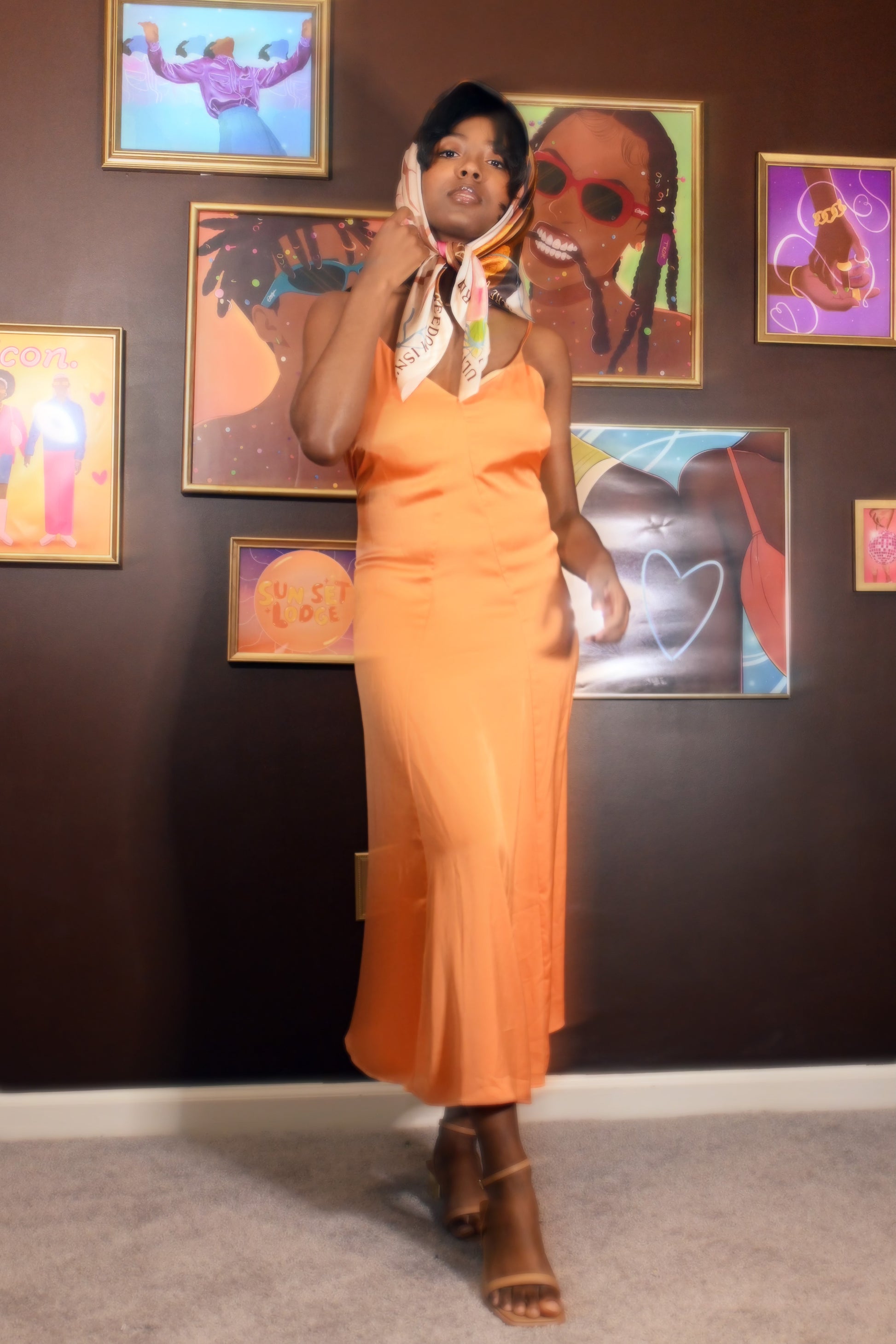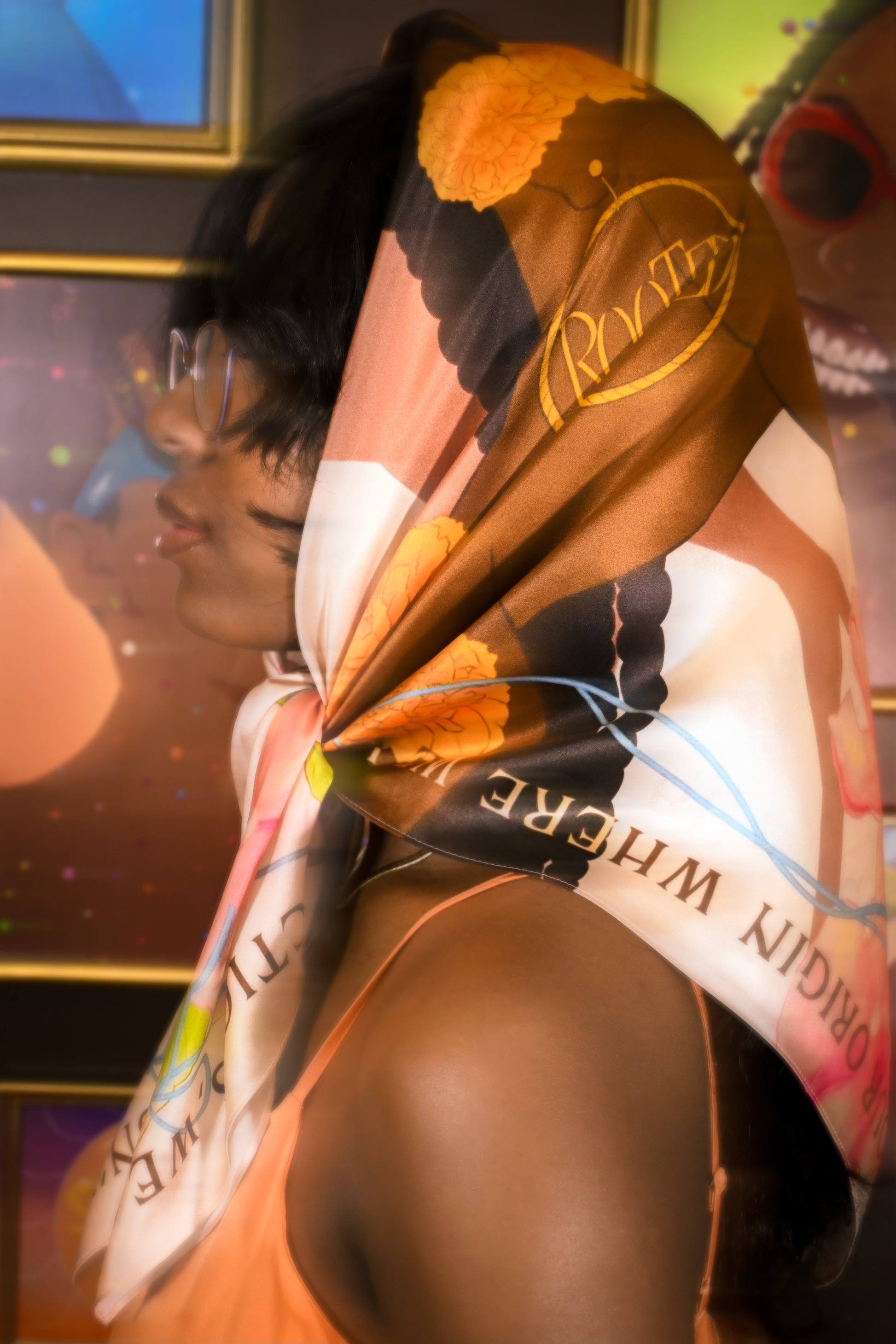 Introducing our very first satin scarf, featuring an exquisite artwork celebrating Black women's beauty and heritage. The central focus is a depiction of a confident Black woman adorned with braids and marigold flowers, complemented by elegant earrings engraved with the empowering word "ROOTED". Behind her stands a majestic tree, its branches adorned with delicate pink flowers and lush green leaves, symbolizing growth and resilience.